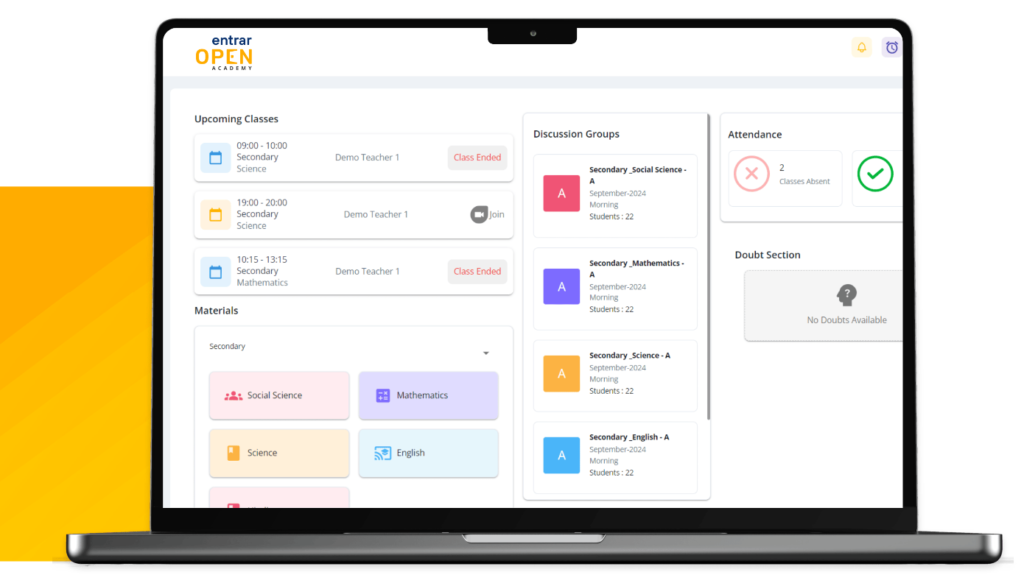 We believe that learning should be limitless and driven by measurable outcomes, and therefore ENTRAR OPEN – A fully integrated and comprehensive AI-powered learning ecosystem for students – in a classroom set up or outside as an Independent learner. Dedicated to democratizing education it makes quality learning accessible and affordable for all. Ensuring seamless, structured management of online learning, whether for individual self-paced learners or institutions expanding their digital footprint. With its multidimensional tech backbone, Entrar Open offers AI-powered, mentor-guided learning environments for learners while enabling institutions to integrate AI in Academics and Assessment for more personalized and better learning outcomes within the school ecosystem, across all geographies, through online or hybrid models. Entrar Open, opens up new possibilities, new ideas, new ways of delivering education on ground and more.