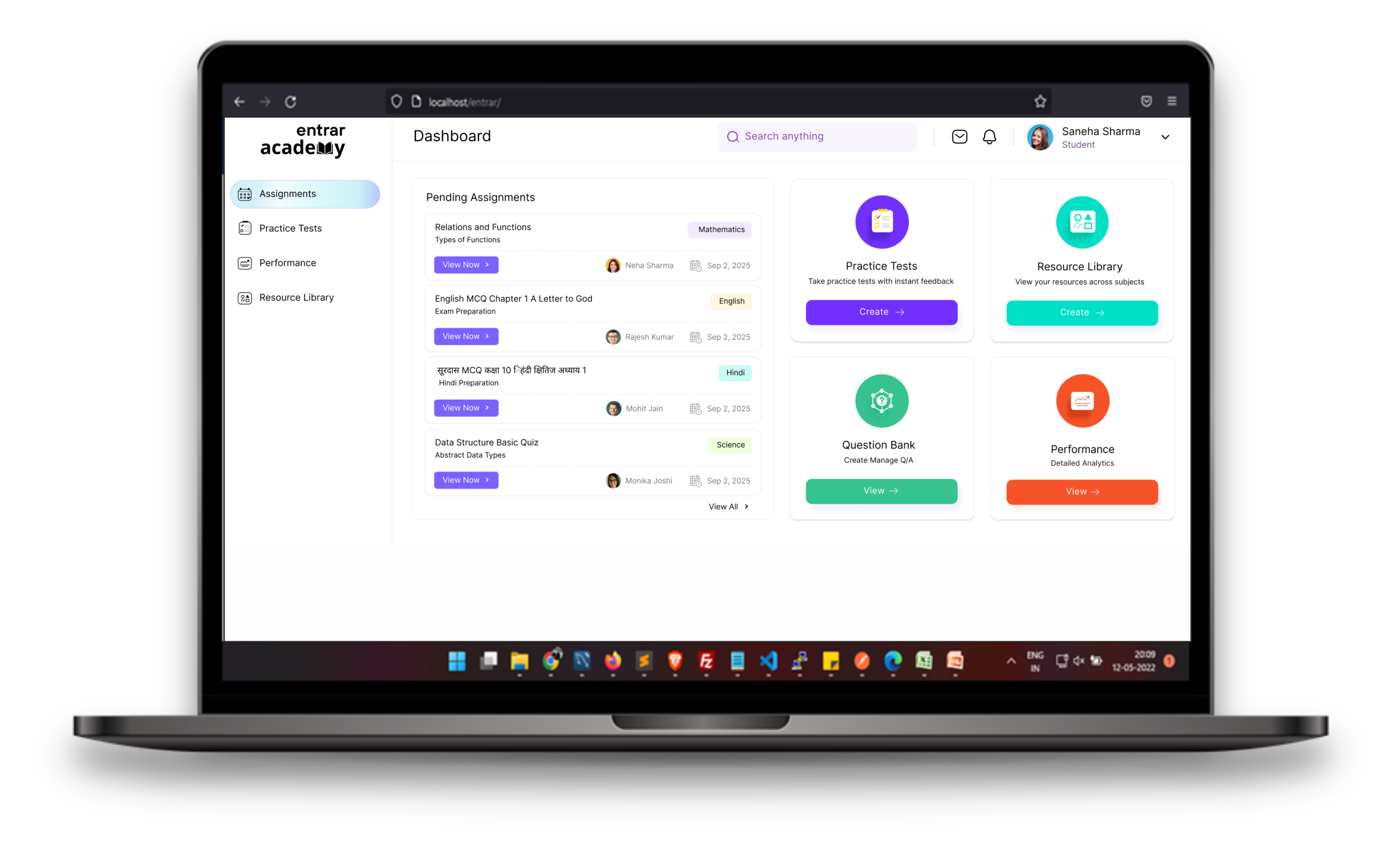 The student LMS dashboard has all the modules to enable and assist online learning. From Ai assistance, to cognitive level based learning path, mock tests, live class links, resources, assignments, assessments, tests, learning-gap analysis report everything else needed to complete the academic journey successfully.